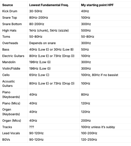 This is a PDF that shows all the lowest fundamental frequencies for the most common sources found on an input list. It also shows my "starting point" setting for all high pass filters.